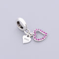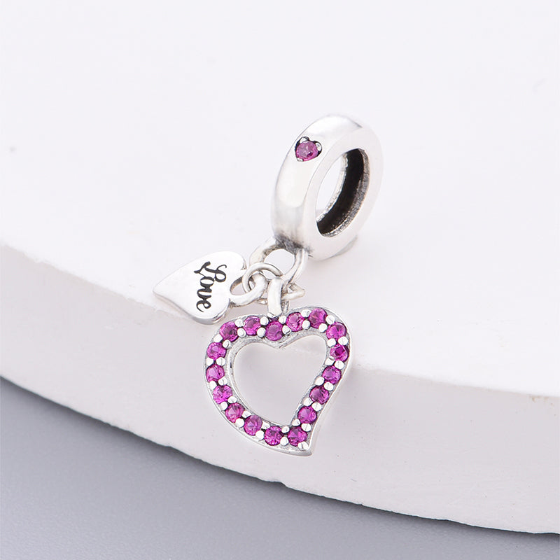 - Design: A double dangle featuring an open heart frame encrusted with pavé-set pink cubic zirconia, paired with a polished heart tag engraved with "love". The bail is accented with a single pink crystal, echoing the vibrant sparkle of the main design.