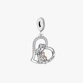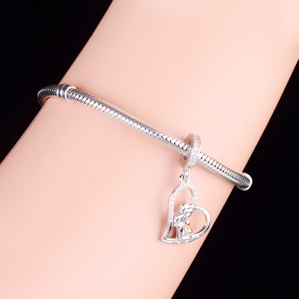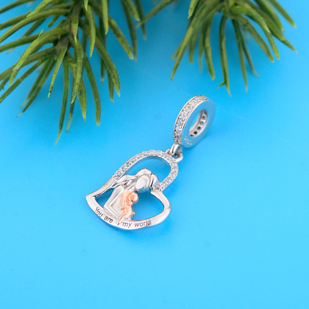 • Design: The charm features an openwork heart frame, pavé-set with sparkling cubic zirconia along the top curve. Inside, a detailed silhouette captures a mother gently embracing her newborn baby, with the baby accented in warm rose gold-tone plating for a subtle, loving contrast. The phrase "You are my world" is elegantly engraved along the bottom of the heart.