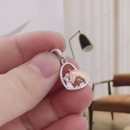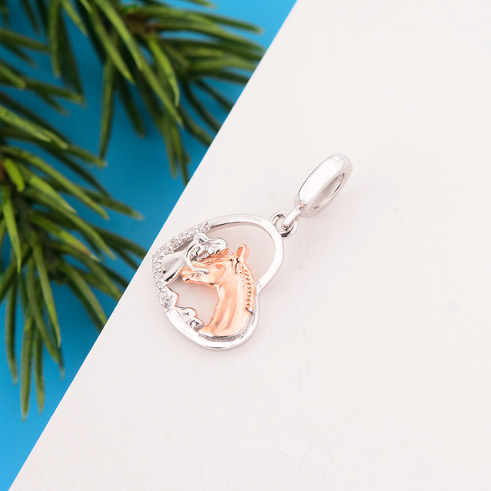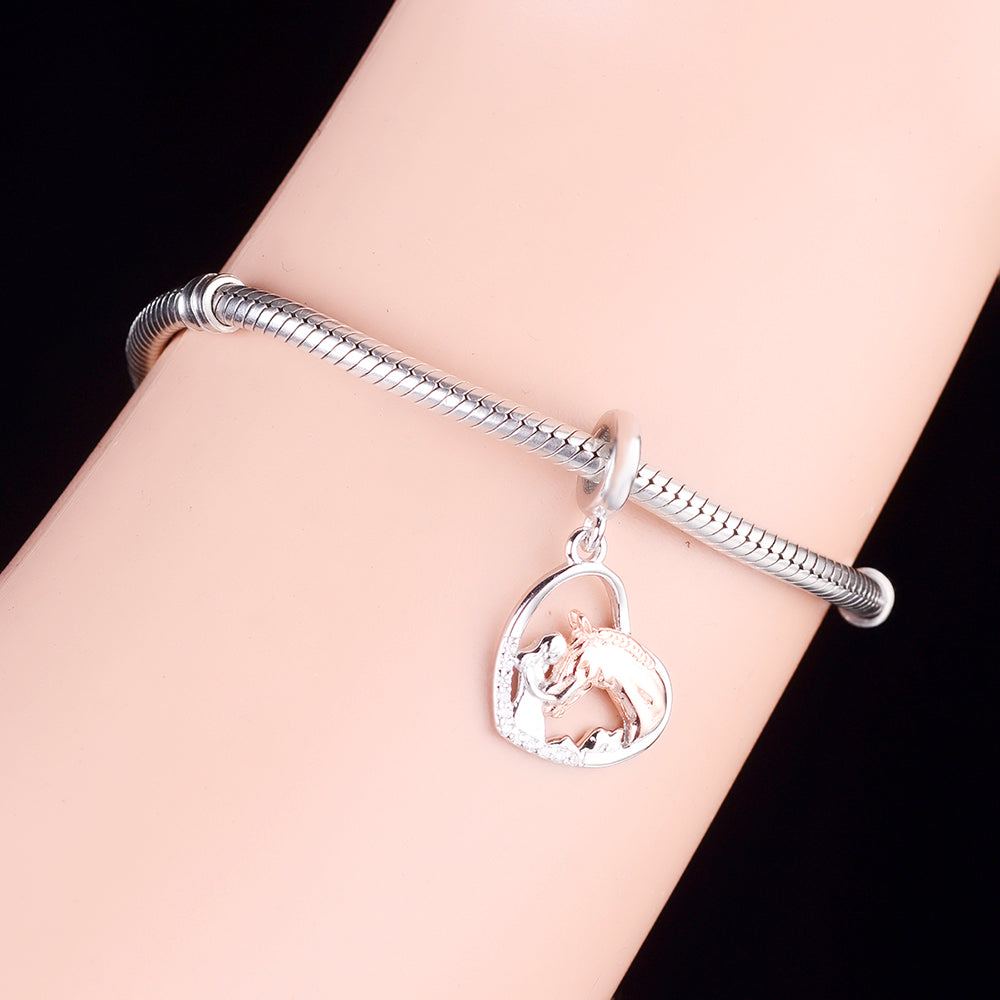 • Design: The charm features an openwork heart frame, pavé-set with sparkling cubic zirconia along its left curve for a touch of glamour. Inside, a detailed silhouette captures a tender moment between a person and their horse—with the horse accented in warm rose gold-tone plating, creating a striking contrast against the polished silver of the human figure. The smooth, classic bail ensures it slides effortlessly onto any bracelet or necklace.