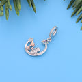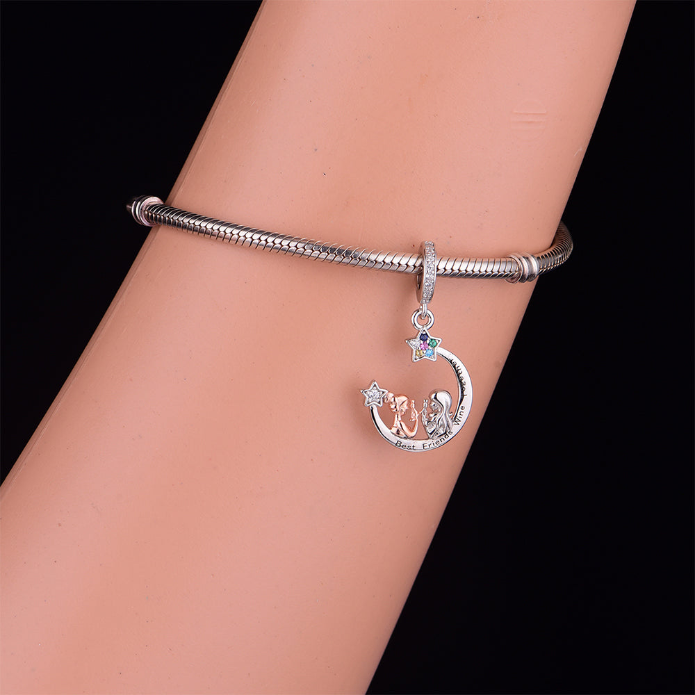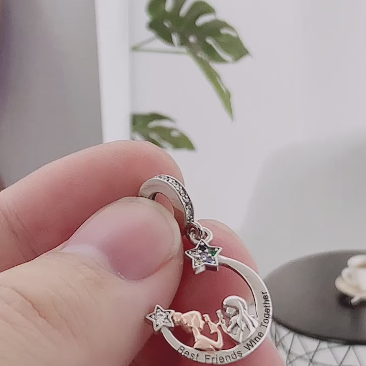 - Design: The charm features a polished crescent moon frame, engraved with the phrase "Best Friends Wine Together" along its curve. Inside, two detailed silhouettes toast with wine glasses—one accented in warm rose gold-tone plating, the other in sleek silver. A sparkling, multi-colored cubic zirconia star sits at the top of the moon, adding a touch of whimsy and sparkle. The bail is pavé-set with clear cubic zirconia for an extra hint of glamour.