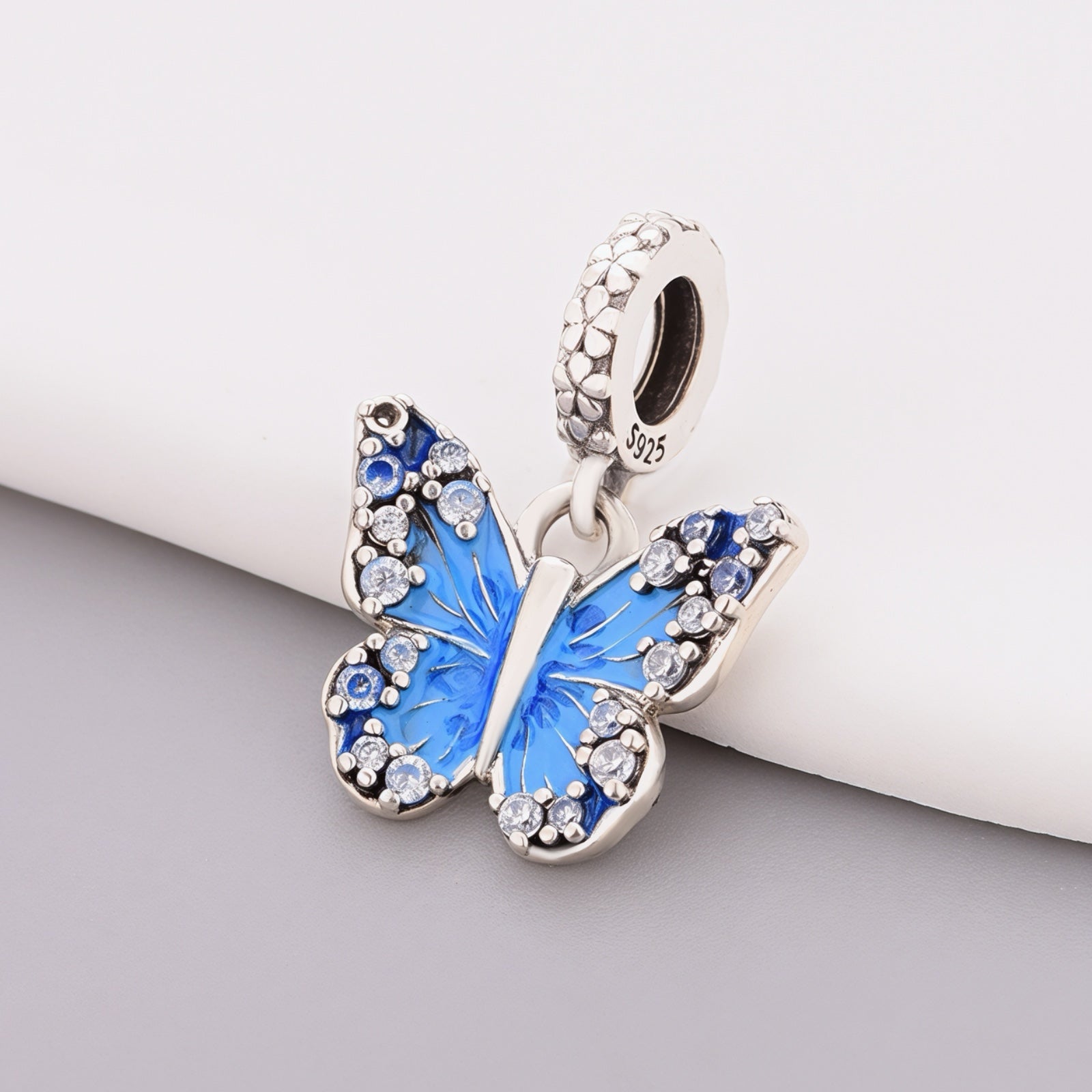 Embrace the grace of nature with the Sparkling Blue Butterfly Dangle Charm. Crafted from 925 sterling silver (compliant with EU REACH standards for lead, cadmium, and nickel), this charm showcases a vibrant blue enamel butterfly design, adorned with glistening cubic zirconia across its wings—plus a fully paved crystal bead on the bail for extra shimmer.
