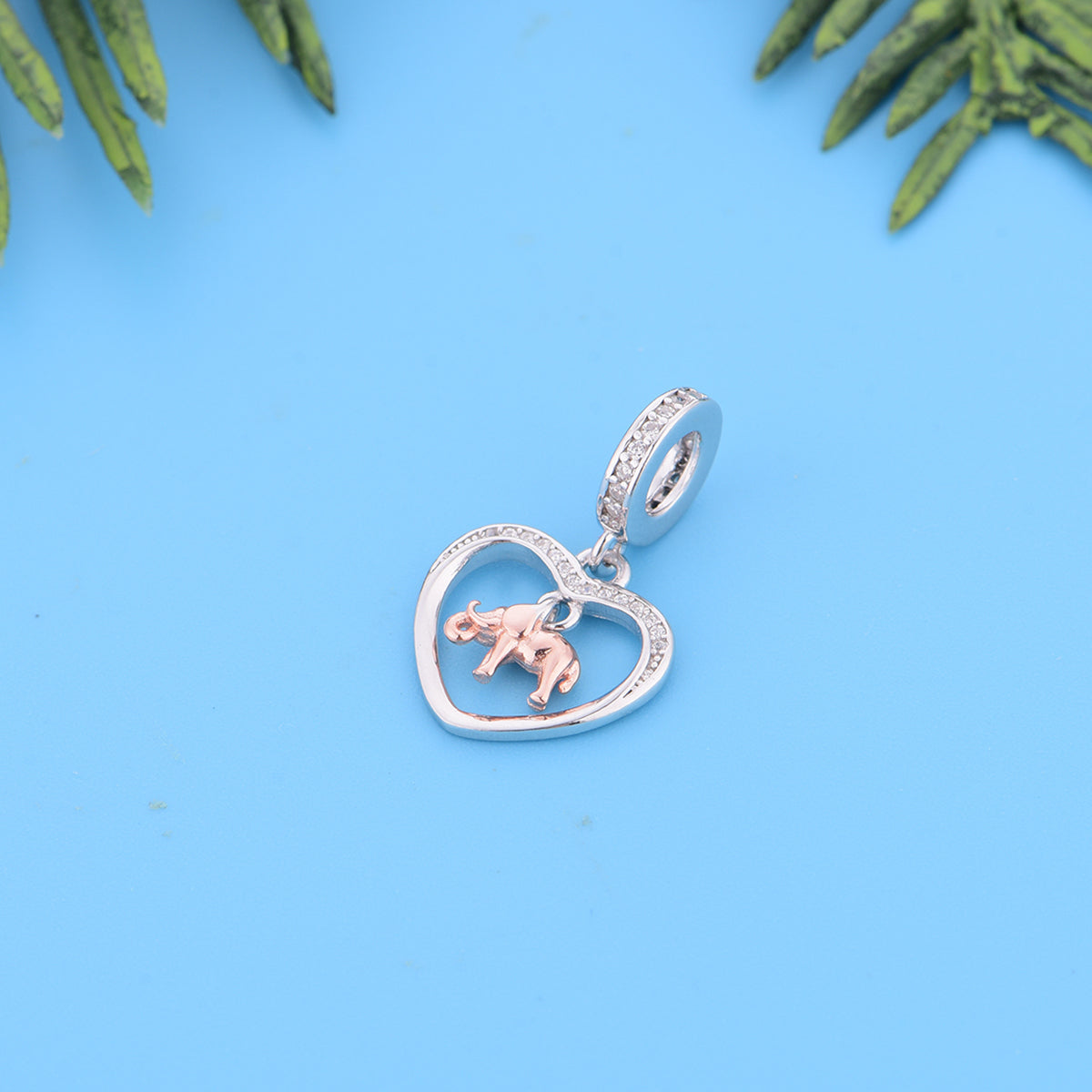 Celebrate elegant two-tone charm with the Crystal Heart & Rose Gold Elephant Dangle Charm. Crafted from 925 sterling silver (compliant with EU REACH standards for lead, cadmium, and nickel), this piece features a crystal-adorned silver heart frame, inside which hangs a delicate rose gold elephant silhouette—paired with a sparkling crystal-studded bail for extra shimmer. Perfect for adding a gentle, sophisticated touch to your jewelry stack, it’s a lovely accessory for daily wear or a heartfelt gift for someone who treasures symbolic pieces (elephants often represent luck and loyalty). Fit All Major Brands of Bracelets & Necklaces – a shimmering, refined tribute to affection and timeless symbolism.