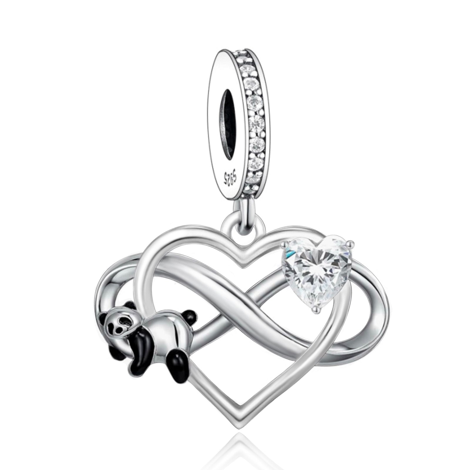 Celebrate playful tender charm with the Panda & Infinity Dual-Heart Dangle Charm. Crafted from 925 sterling silver (compliant with EU REACH standards for lead, cadmium, and nickel), this delicate piece (bail diameter: 5mm; heart-panda main body: approx. 16×14mm) features intertwined infinity hearts paired with a cute black-enamel panda and a sparkling heart crystal—plus a crystal-paved bail for extra shimmer.