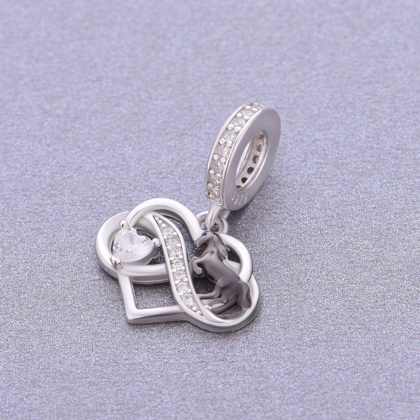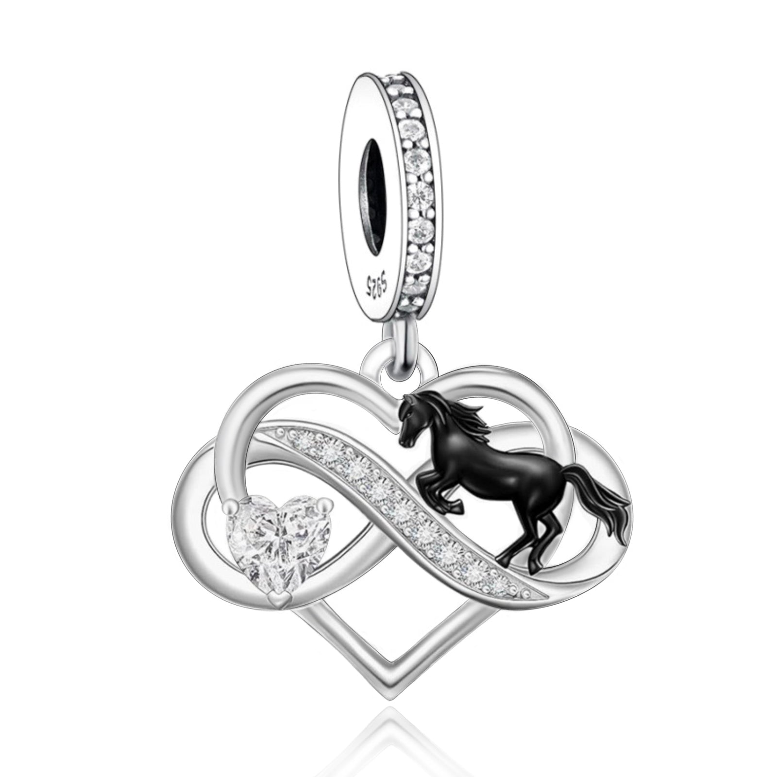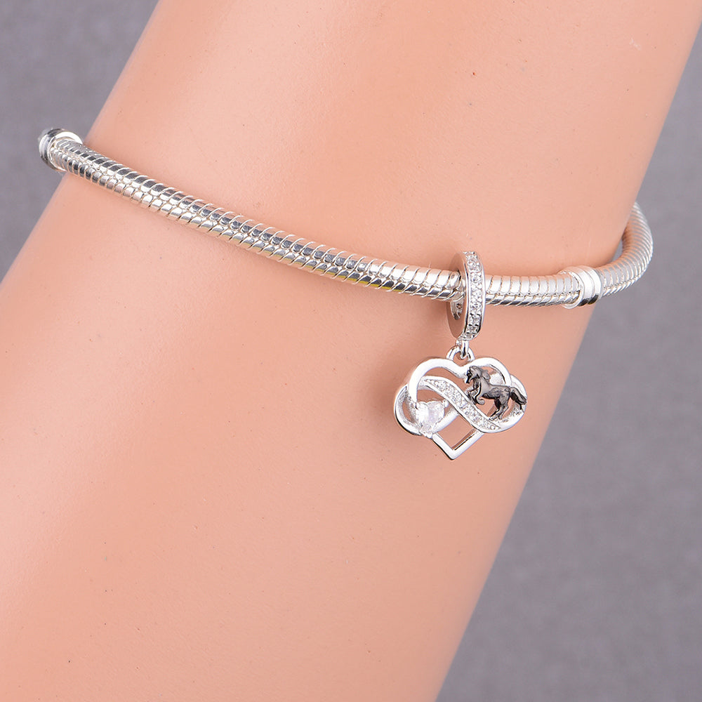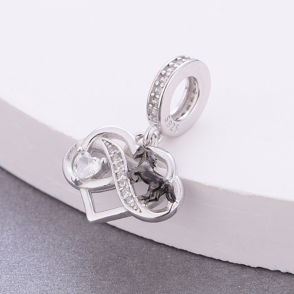 Celebrate graceful tender charm with the Horse & Infinity Dual-Heart Dangle Charm. Crafted from 925 sterling silver (compliant with EU REACH standards for lead, cadmium, and nickel), this delicate piece (bail diameter: 5mm; heart-horse main body: approx. 16×14mm) features intertwined infinity hearts paired with a sleek black-enamel horse and a sparkling heart crystal—plus a crystal-paved accent strip for extra shimmer.