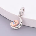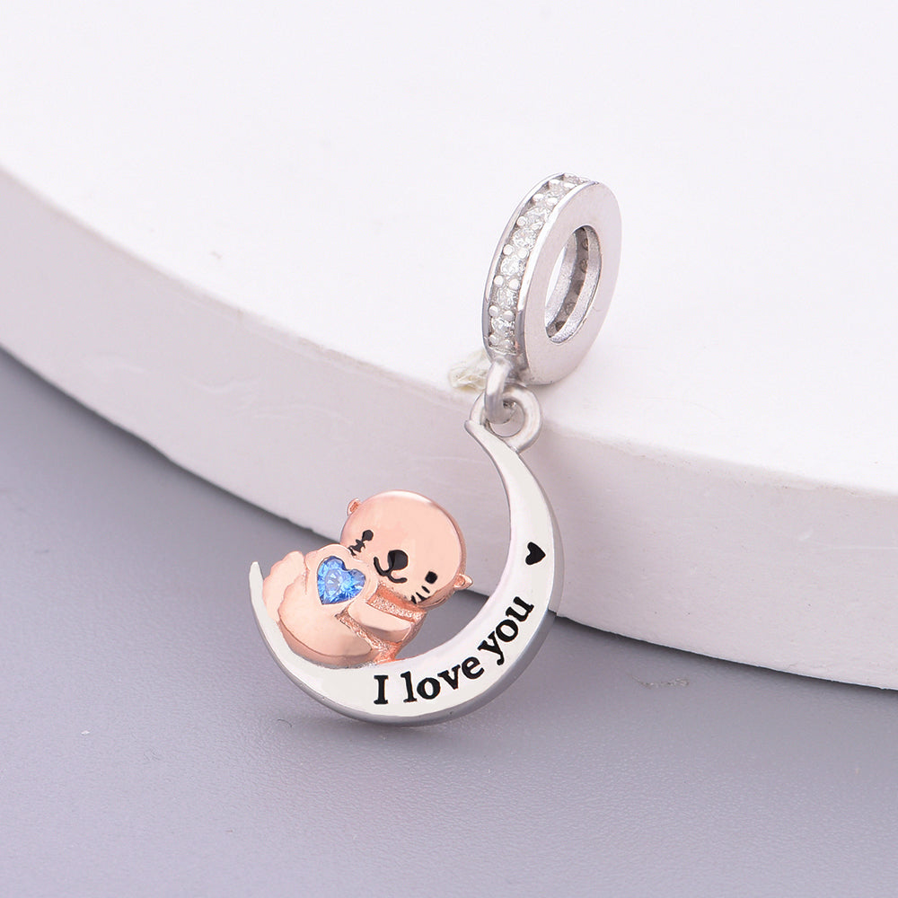 Celebrate sweet tender charm with the "I love you" Otter-on-Moon Dangle Charm. Crafted from 925 sterling silver (compliant with EU REACH standards for lead, cadmium, and nickel), this delicate piece features a crescent moon frame engraved with "I love you", paired with a cozy rose-toned enamel otter holding a bright blue heart crystal for warm, playful charm. Perfect for adding a gentle, endearing touch to your jewelry stack, it’s a lovely accessory for daily wear or a heartfelt gift for someone who treasures soft, charming symbolic pieces. Fit All Major Brands of Bracelets & Necklaces – a warm, sparkling tribute to sweet affection and cozy whimsy.