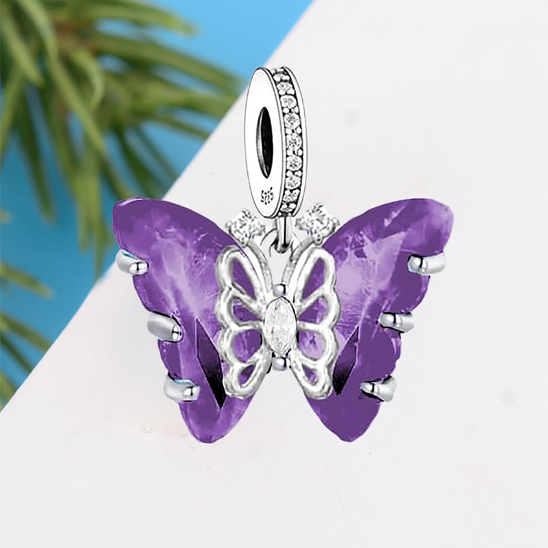 Celebrate elegant tender charm with the Purple Crystal Butterfly Dangle Charm. Crafted from 925 sterling silver (compliant with EU REACH standards for lead, cadmium, and nickel), this delicate piece features a striking butterfly design with luminous purple crystal wings, paired with a sleek silver butterfly accent (adorned with tiny sparkling crystals) for soft, glamorous charm. Perfect for adding a gentle, sophisticated touch to your jewelry stack, it’s a lovely accessory for daily wear or a heartfelt gift for someone who treasures elegant, symbolic pieces. Fit All Major Brands of Bracelets & Necklaces – a shimmering, refined tribute to grace and subtle luxury.