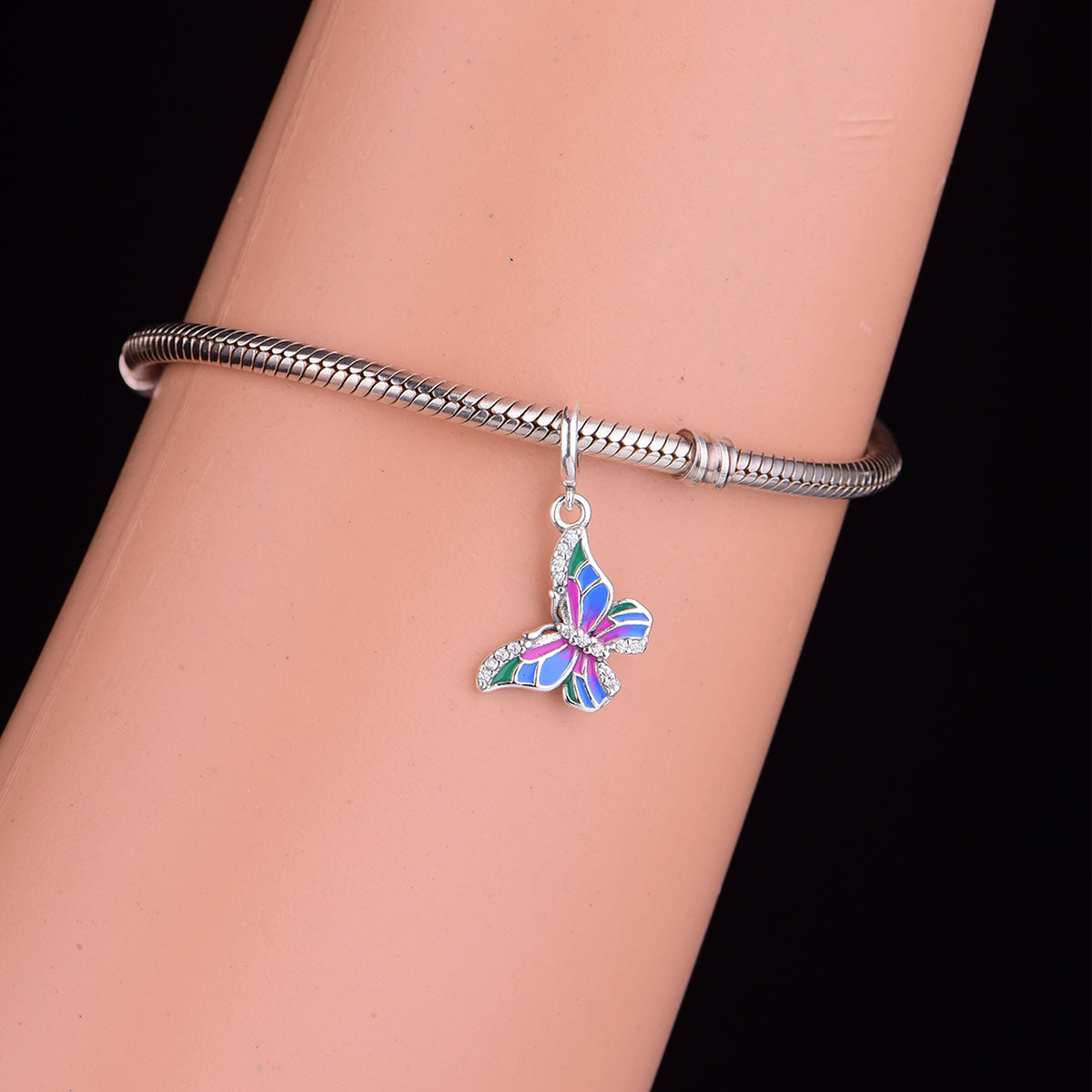 Celebrate vibrant tender charm with the Iridescent Butterfly Dangle Charm. Crafted from 925 sterling silver (compliant with EU REACH standards for lead, cadmium, and nickel), this delicate piece features a butterfly design adorned with iridescent enamel (blending blue, green, pink hues) and sparkling crystal accents for luminous, playful charm. Perfect for adding a soft, colorful touch to your jewelry stack, it’s a lovely accessory for daily wear or a heartfelt gift for someone who treasures whimsical, nature-inspired symbolic pieces. Fit All Major Brands of Bracelets & Necklaces – a shimmering, lively tribute to vibrant beauty and gentle grace.