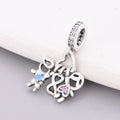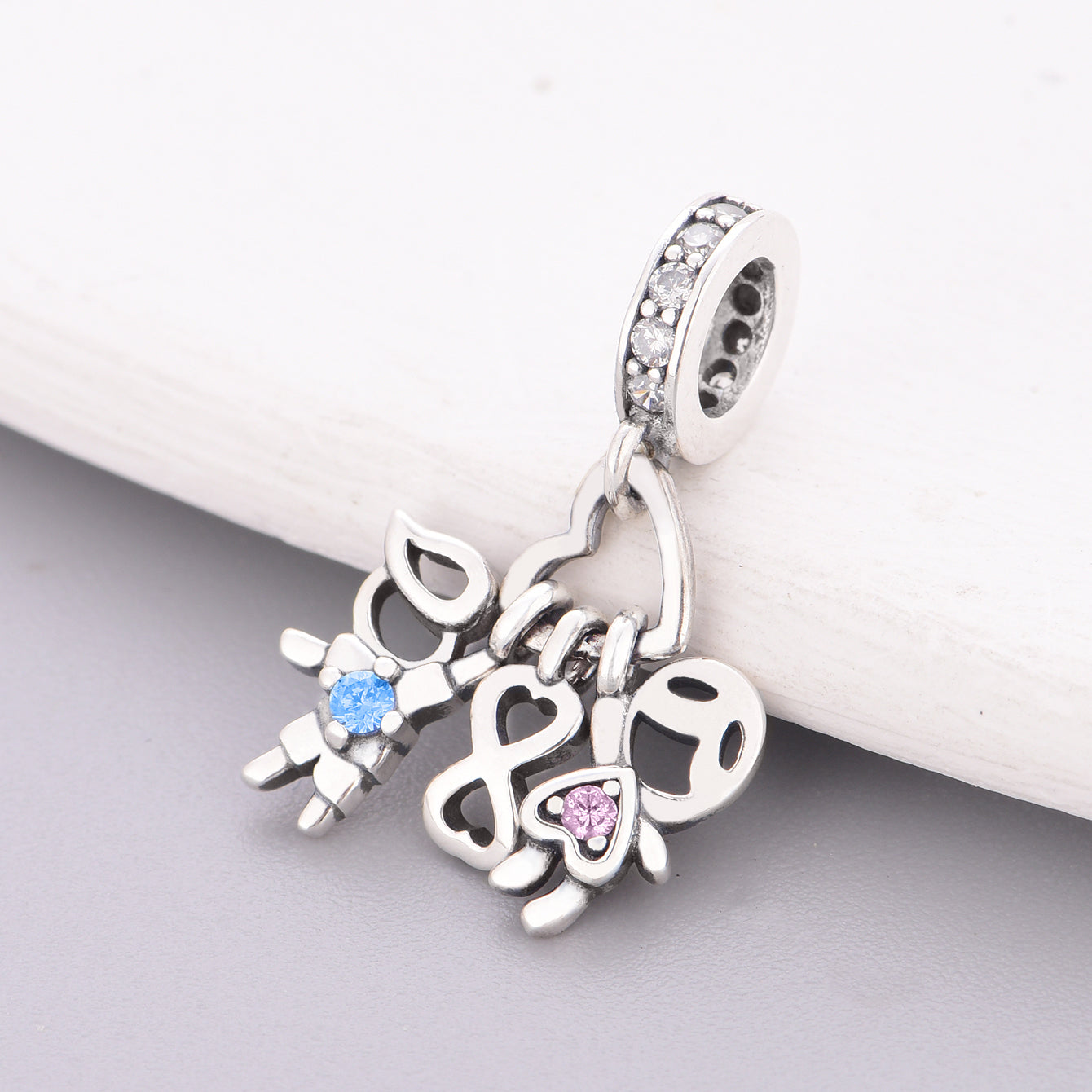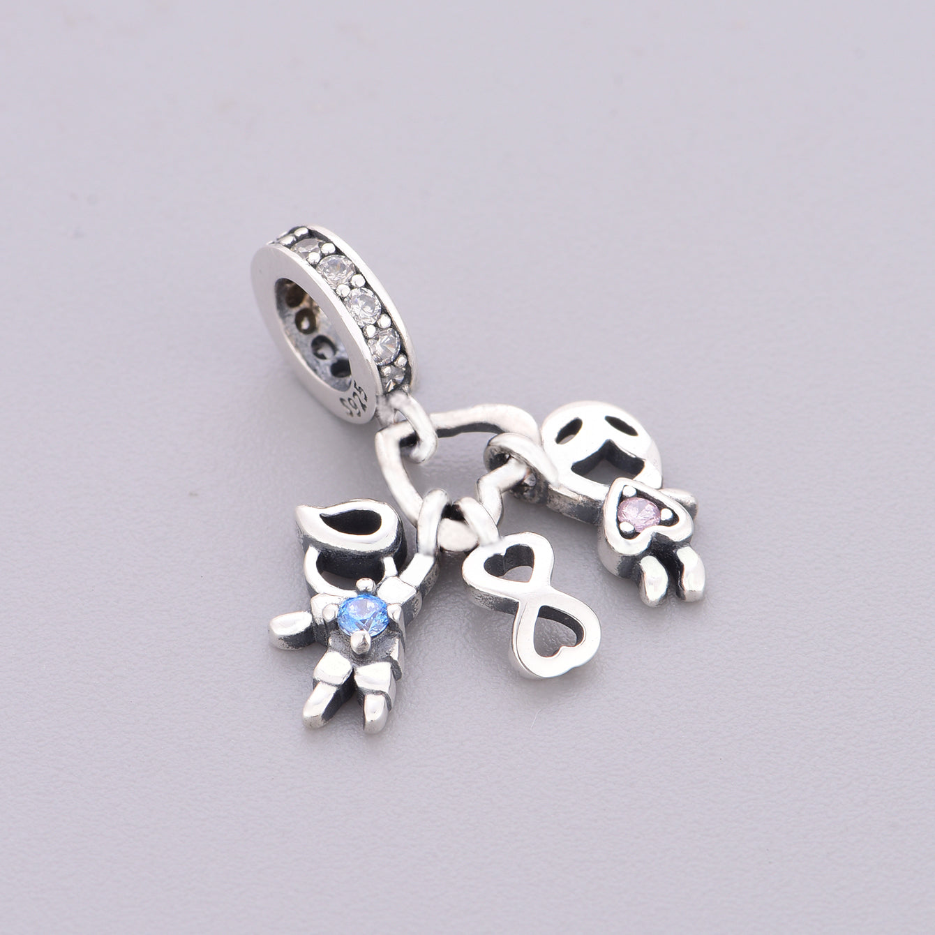 - Design: An openwork cluster of stylized children’s figures, with a heart-shaped motif at the center. One child is accented with a blue cubic zirconia, and another with a pink cubic zirconia, representing brothers and sisters. The bail is encrusted with shimmering pavé-set crystals for extra sparkle.