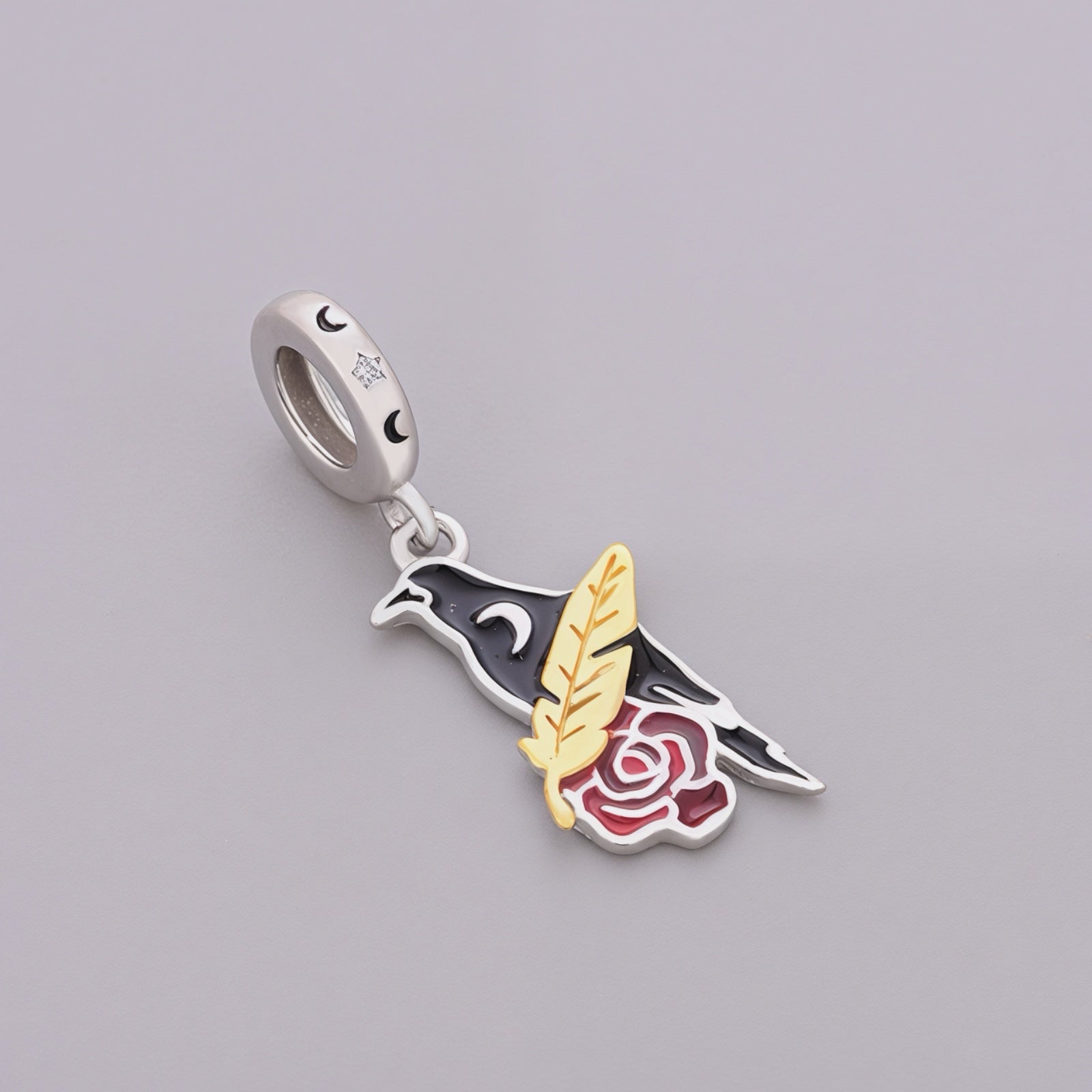 • Design: A striking black enamel raven, detailed with a tiny moon motif on its wing, paired with a vibrant red enamel rose and two polished gold-toned feathers. The bail is accented with a single cubic zirconia and moon engravings, echoing the mystical theme.