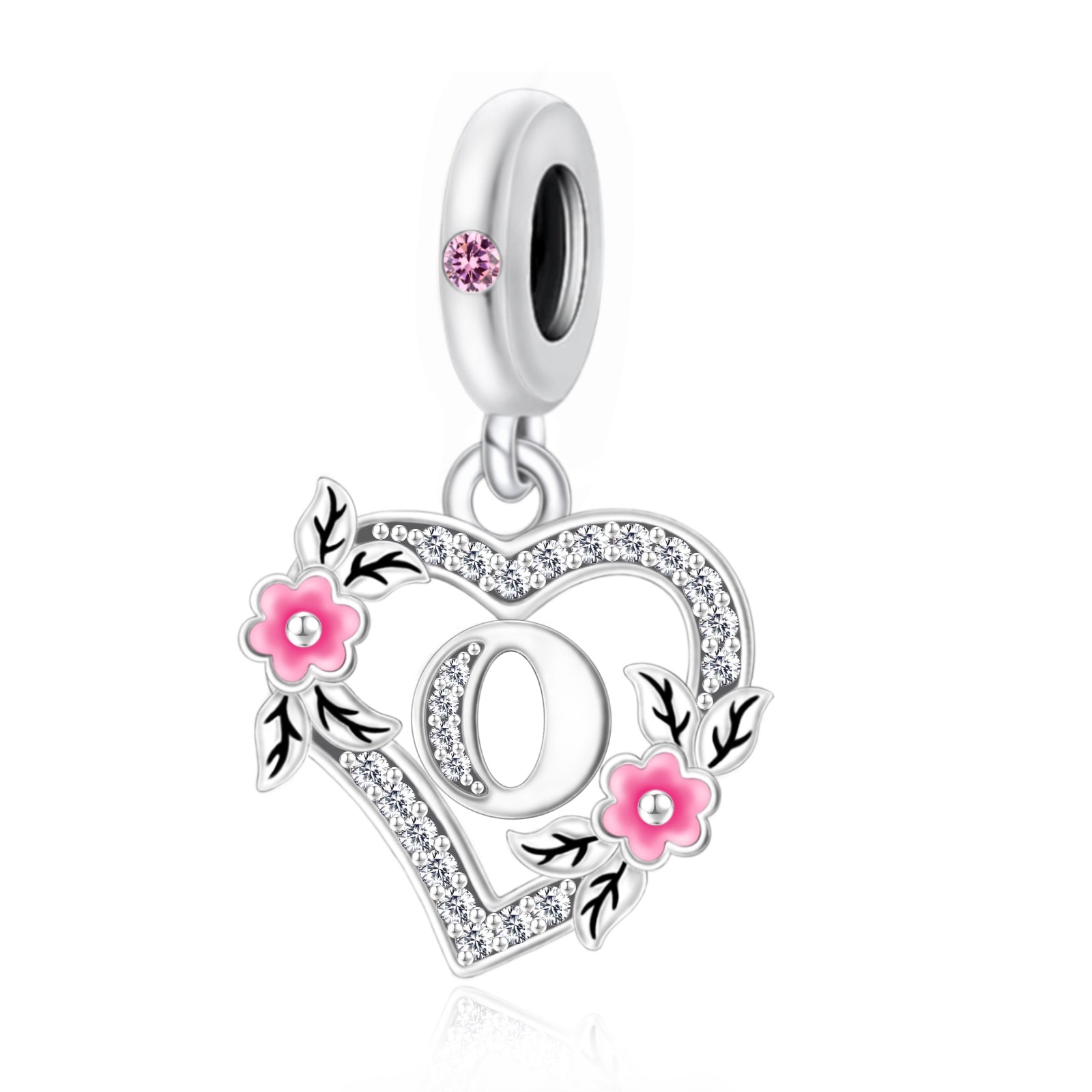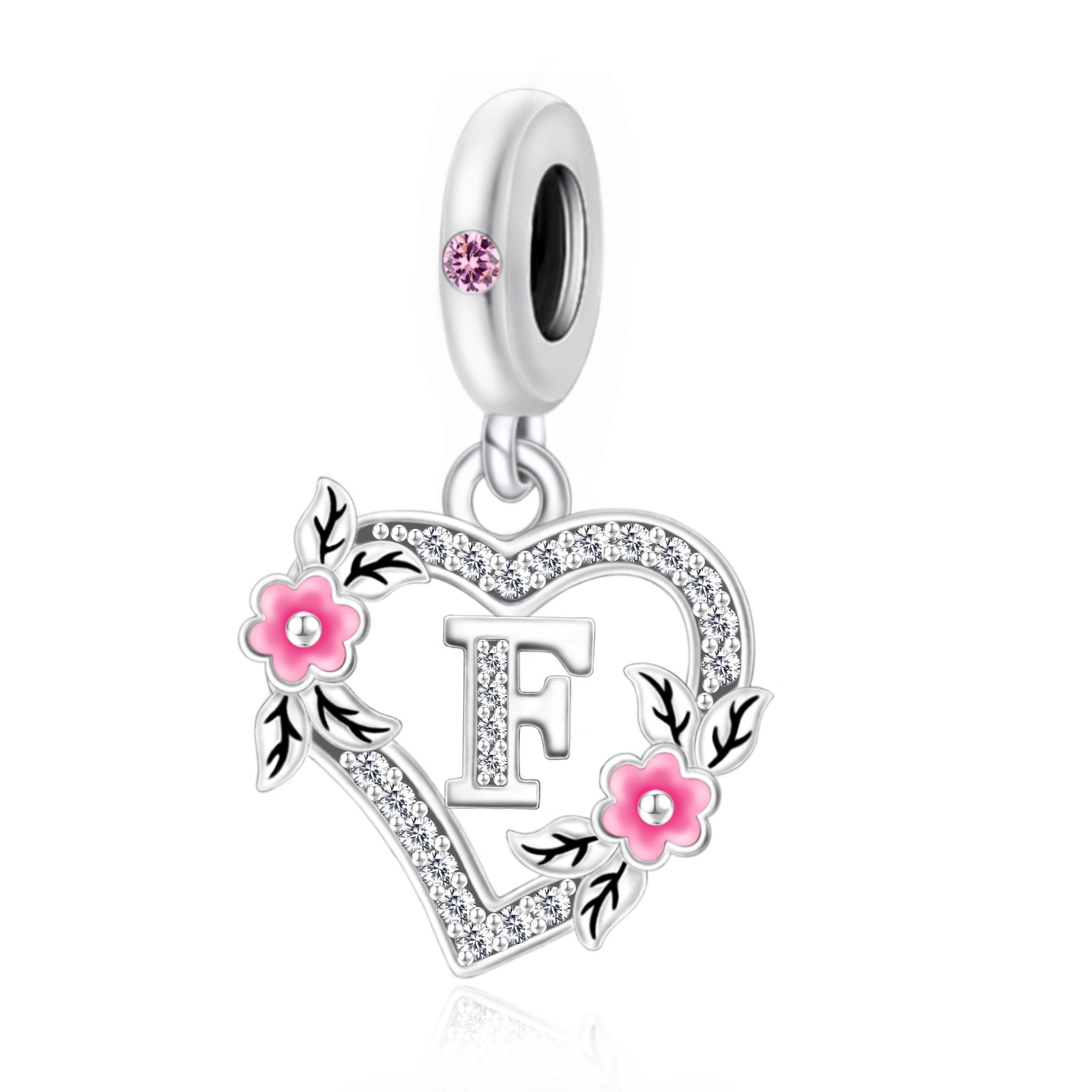 • Design: A heart-shaped frame encrusted with shimmering cubic zirconia, adorned with hand-painted pink enamel flowers and leaves. At the center sits a polished initial (A–H), creating a unique symbol of your identity.