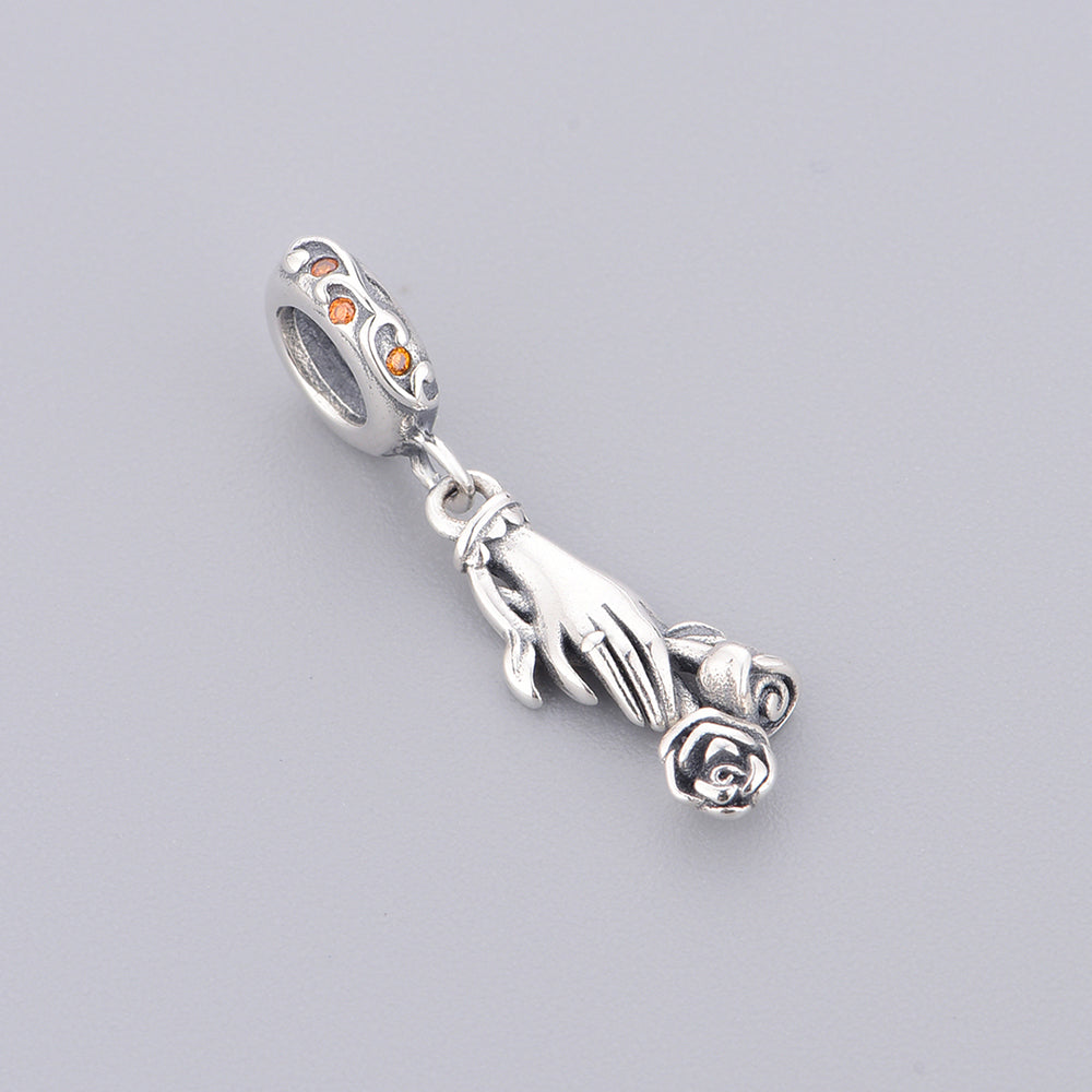 • Design: A polished relief of an open hand, gracefully positioned alongside detailed rose buds and a blooming rose. The bail is adorned with three warm orange cubic zirconia and subtle scrollwork, adding a hint of vintage romance.