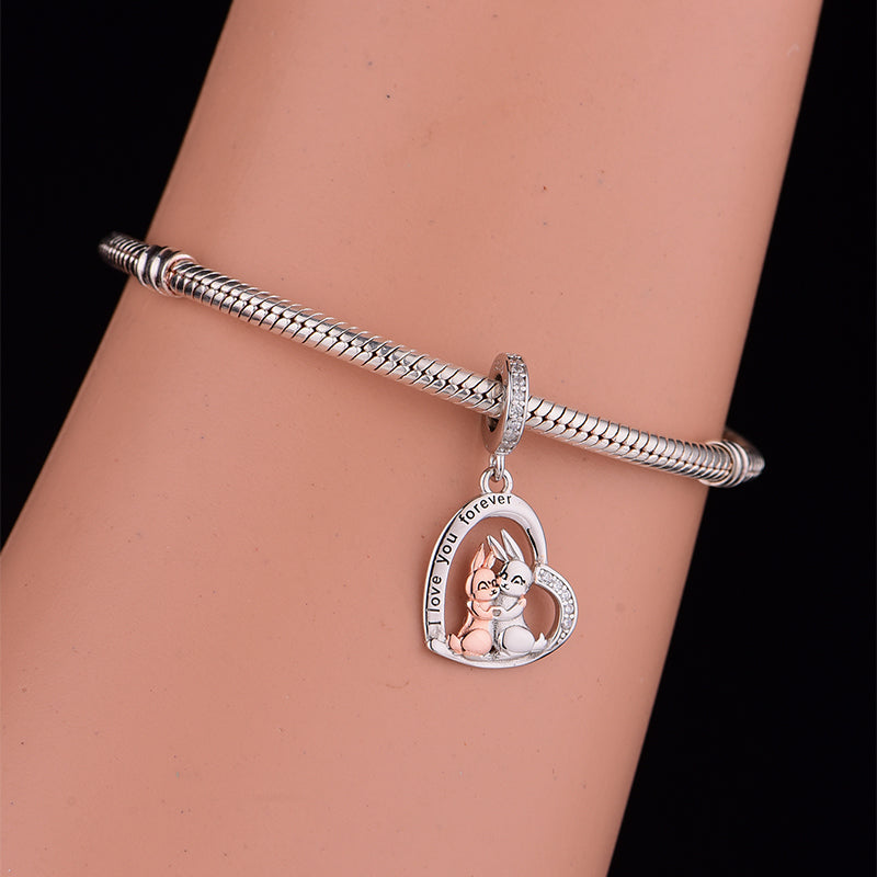 Cherish your sweet bond with the "Bunny Hug" Heart Charm by RADIVIDE Jewelry. Made of 925 sterling silver (marked with "S925"), this charm shines with sparkling crystal accents on the heart frame. Inside, two cuddly bunnies (soft peach and gentle gray) embrace closely, paired with the heartfelt phrase "I love you forever" engraved along the edge — blending playful cuteness with sincere devotion.